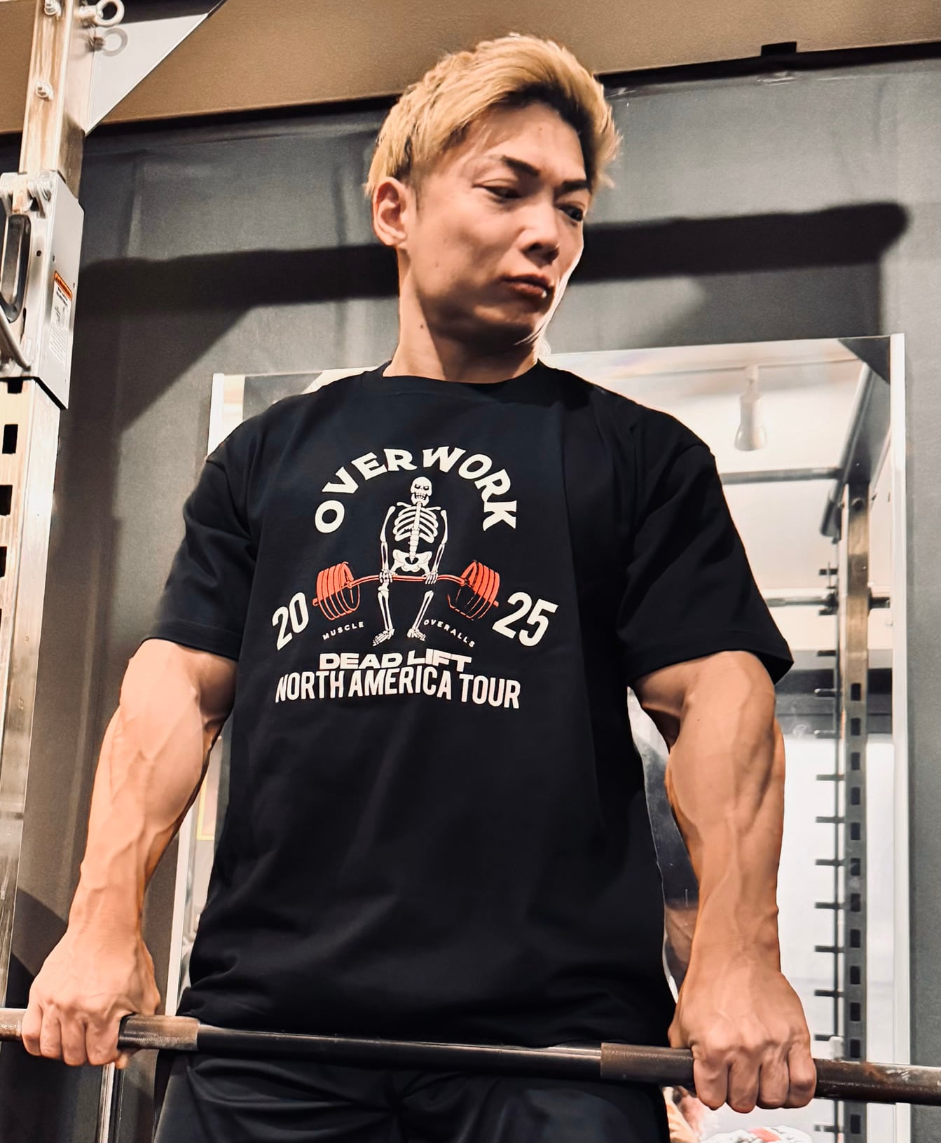 筋トレの王様種目 "DEAD LIFT" をバンド名に見立て、北米ツアーデザイン風に仕立てた1着。